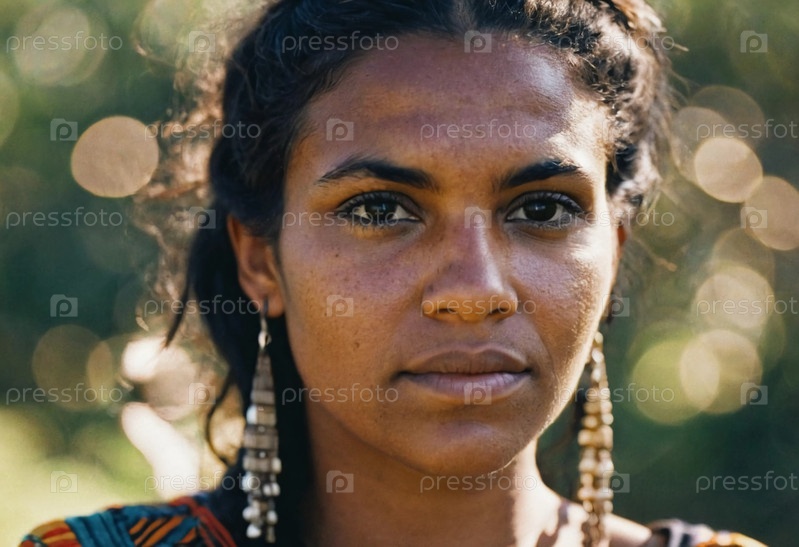 Этот поразительный портрет изображает молодую австралийскую аборигену с глубокими выразительными глазами, подчеркивающими ее культурную идентичность и связь с землей вокруг искусственного интеллекта