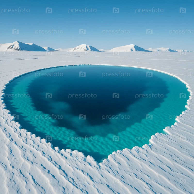 Окружающий лед показывает признаки зимнего замерзания, в то время как горы поднимаются на заднем плане под синим небом