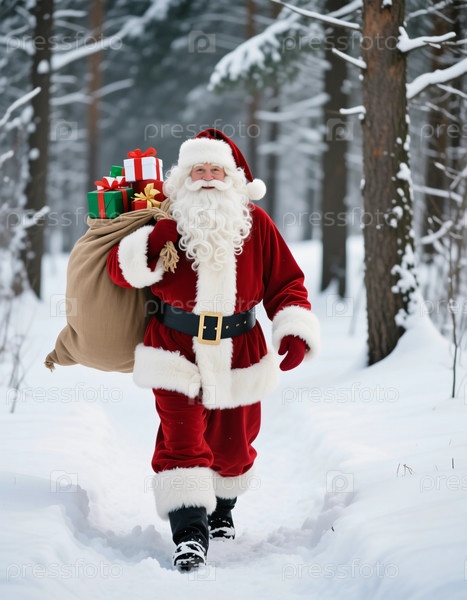 Санта-Клаус идет по заснеженной тропе в лесу, неся большую сумку с подарками и наслаждаясь временем в стране зимних чудес