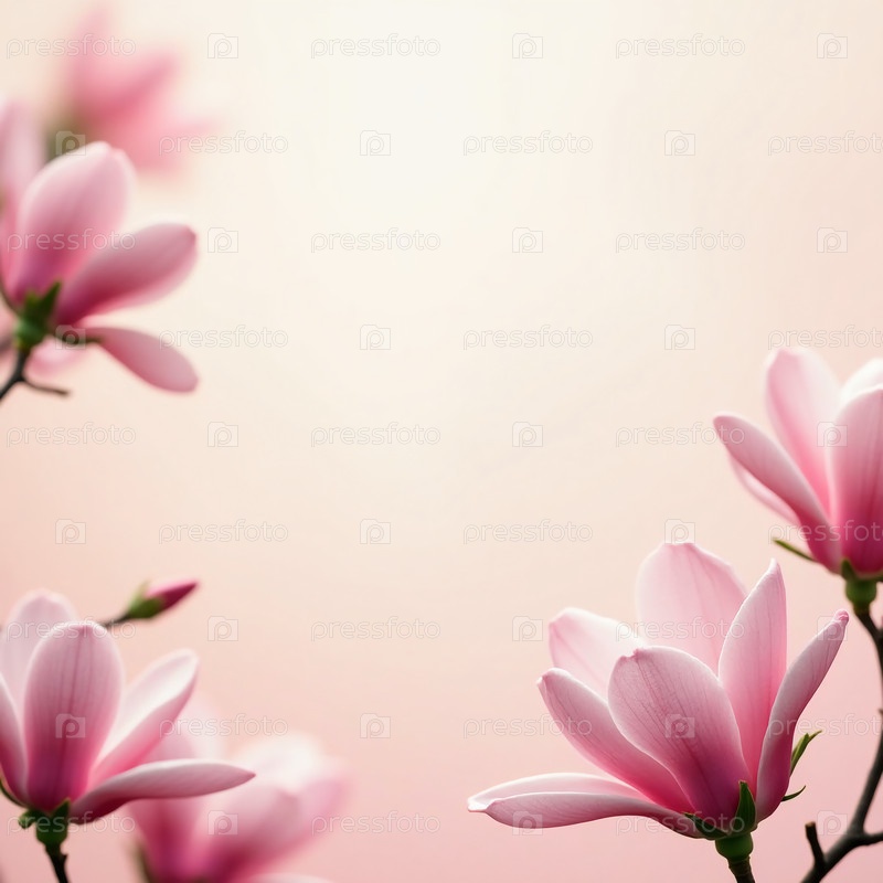 В спокойной обстановке сада изящные розовые цветы магнолии грациозно расцветают на мягком пастельном фоне, захватив суть пробуждения весны и тишину генеративного ИИ