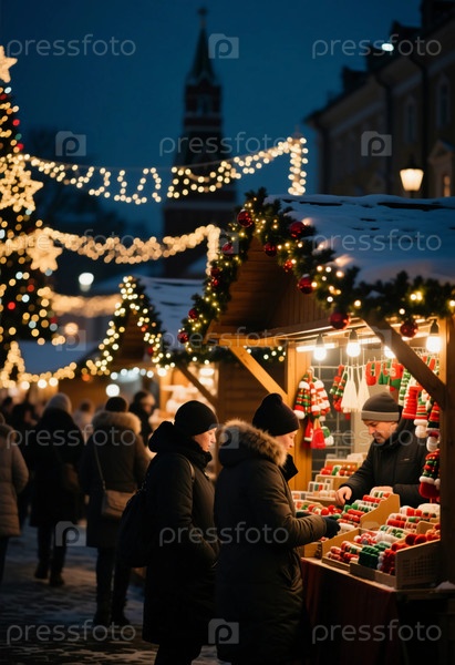 Люди гуляют на рождественском рынке по ночам. На стеллажах выставлены красочные товары и продукты питания. Сверху висят огни, создающие праздничное настроение, а рядом - большое дерево генеративного ИИ