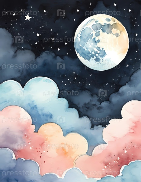 Под звездной ночью светящаяся луна висит над пастельными облаками, нарисованными тонкими акварелями.Это очаровательное произведение искусства вызывает чувство удивления и спокойствия, идеально подходит для любого пространства