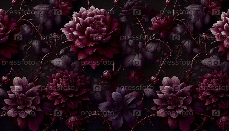 Темный мрачный цветочный бесшовный рисунок с сливовыми и бургундскими цветами на черном, Ai создал изображение