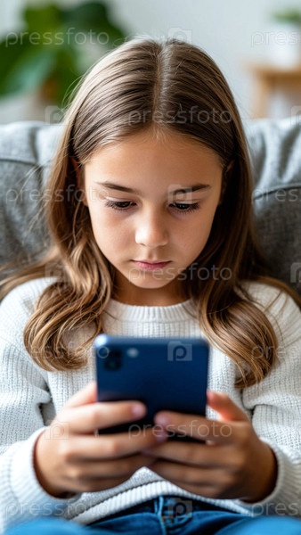 Ребенок со смартфоном в руках лежит / сидит на диване дома