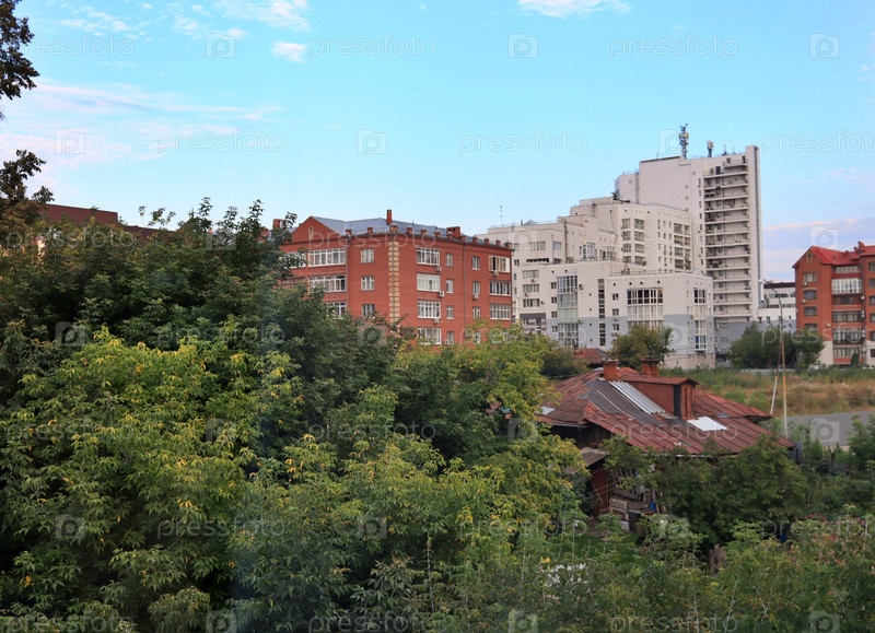 Крыши старых домов на фоне современных многоэтажных зданий