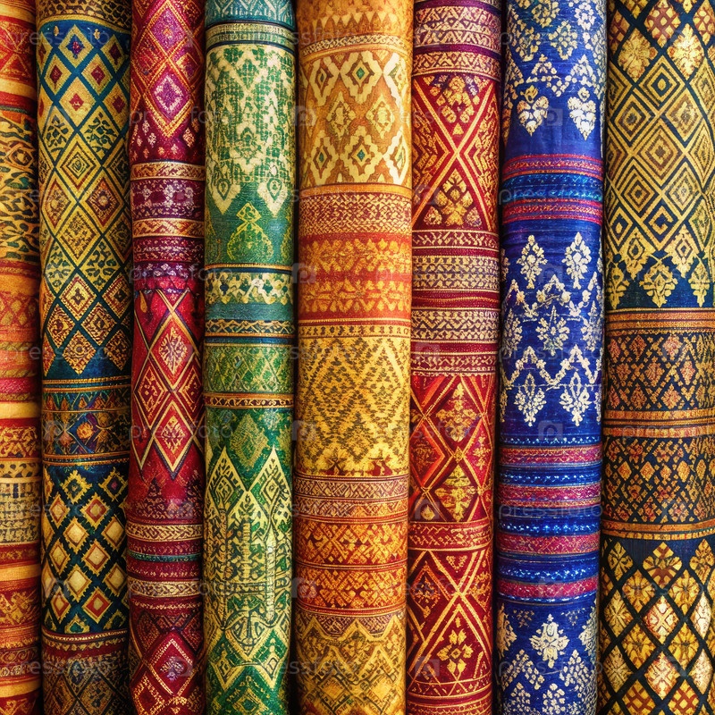 Цветные рулоны традиционной тайской шелковой ткани на рынке