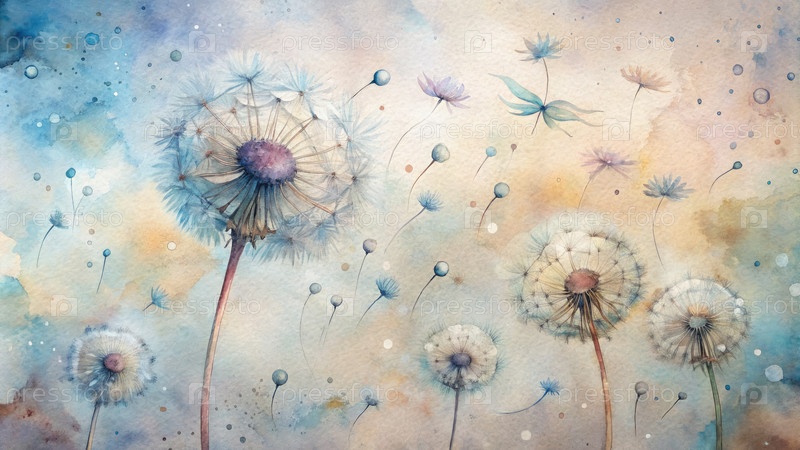 Акварельная живопись одуванчиков, дующих на ветре