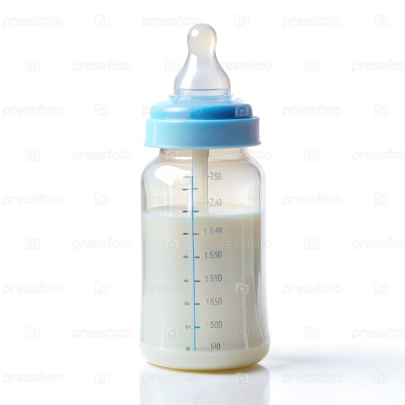 Чистая детская бутылка, заполненная молоком на белом фоне
