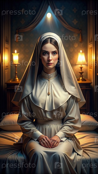 Женщина в белом сидит на кровати в комнате с тусклыми постельными принадлежностями