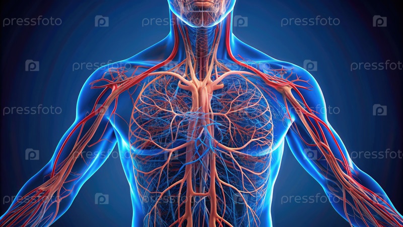Вены и артерии грудной клетки и рук на 3D иллюстрации.Генерирование человеческого ИИ