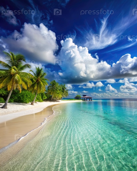 Идиллическая тропическая пляжная сцена с пальмами и чистой голубой водой на Мальдивских островах