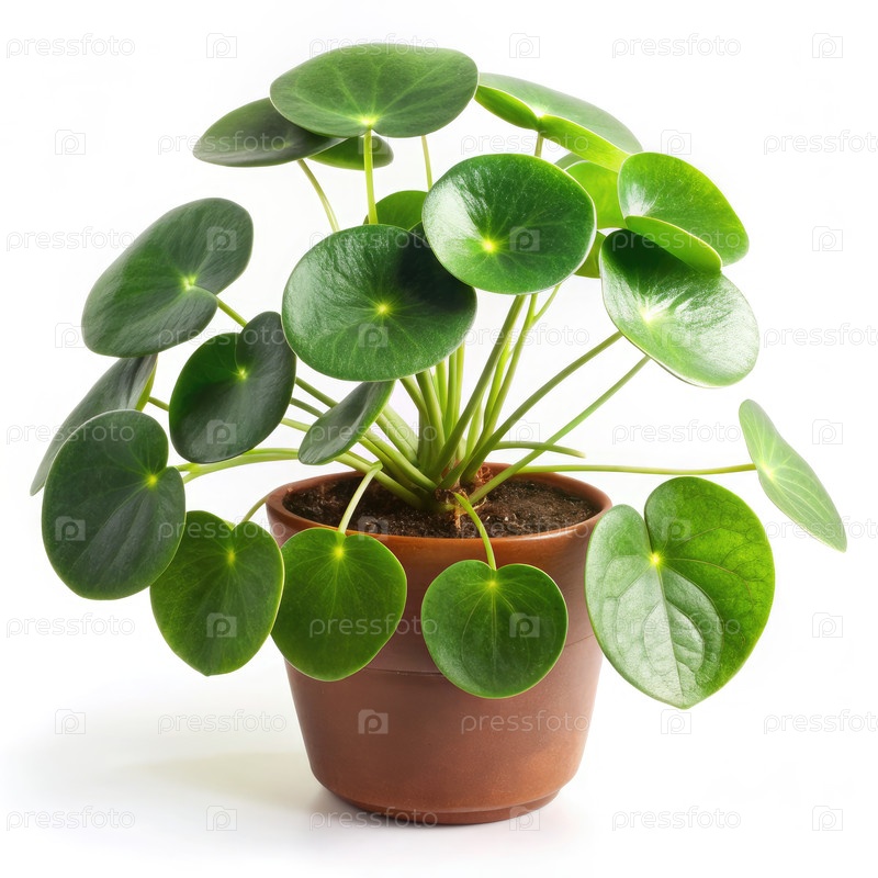 Зеленое растение высаживает пеперомиоиды в коричневой сковороде на белом фоне