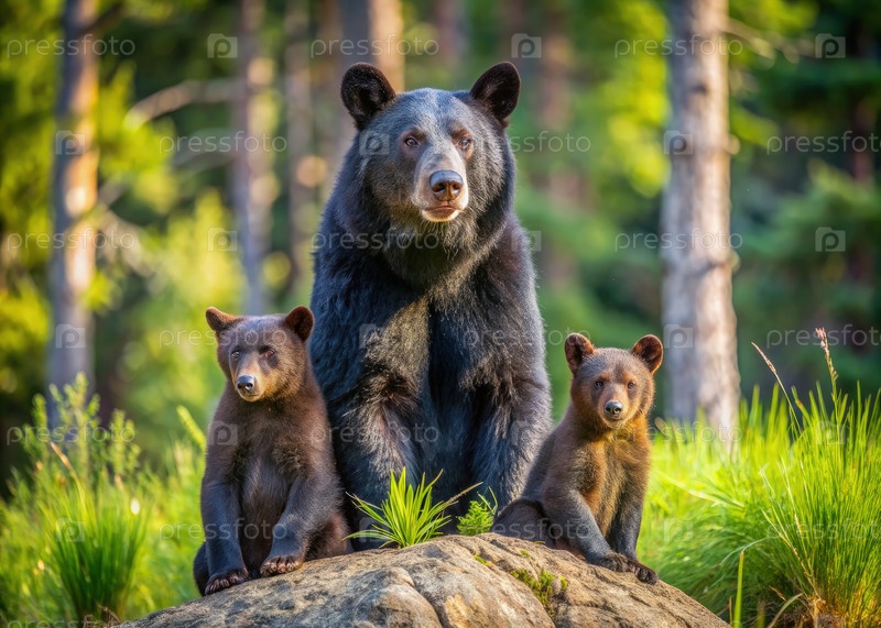 Мать-черный медведь и ее детеныши отдыхают на скале в лесу