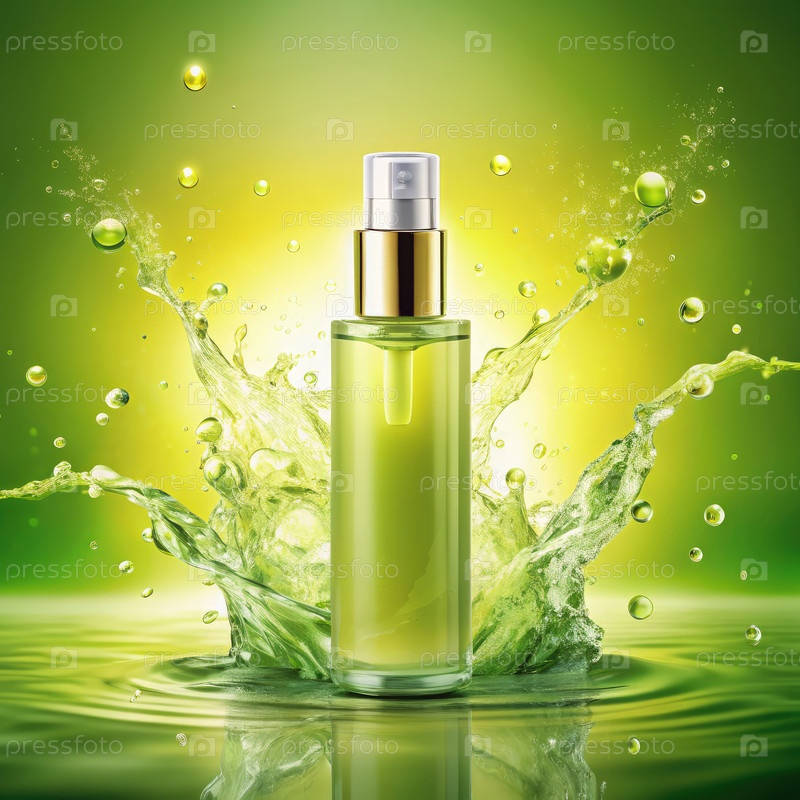 Зеленая косметическая бутылка с жидкостью на зеленом фоне