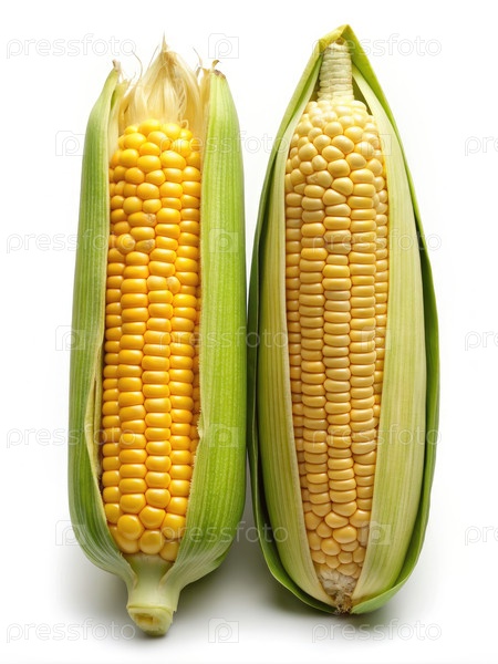 Два свежих кукурузных хлопья были частично развернуты на белом фоне