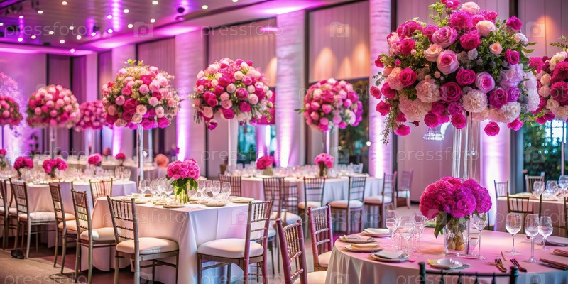 Комната заполнена столами, покрытыми розовыми цветами