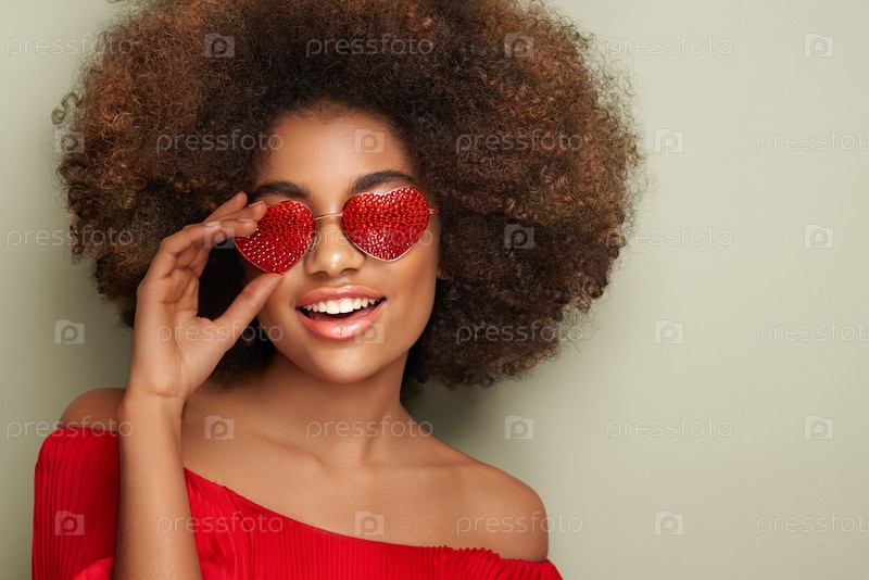Красивый портрет африканской девушки, которая носит солнцезащитные очки в форме сердца