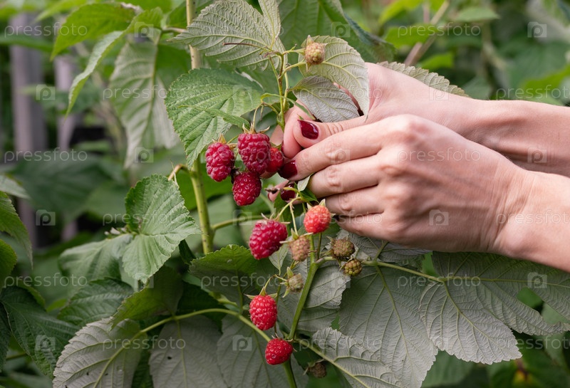 Садоводство, сбор урожая, концепция сельского хозяйства. Покрытие руки пожилой женщины, собирающей малину в открытом саду. Выборочное внимание к красной ягоде в руке