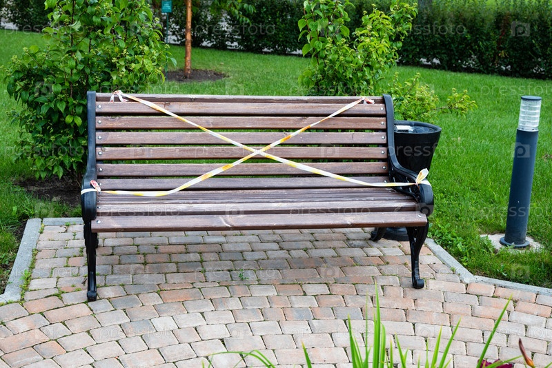 Парковая скамейка, аккуратно обернутая лентой, расположена на асфальтированной территории в саду с зеленой травой и растениями
