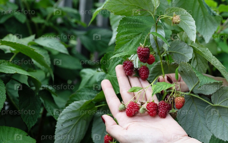 Пара рук аккуратно собирает красные малины из процветающего куста, окруженного зелеными листьями в теплом летнем климате