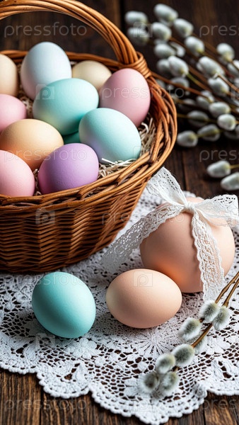 Пасхальные яйца окрашены в мягкие цвета и ивы