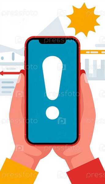 Рука, держащая мобильный телефон, восклицательный знак на экране телефона