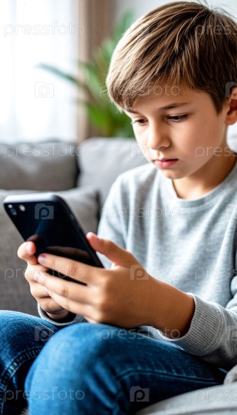 Ребенок со смартфоном сидит на диване дома