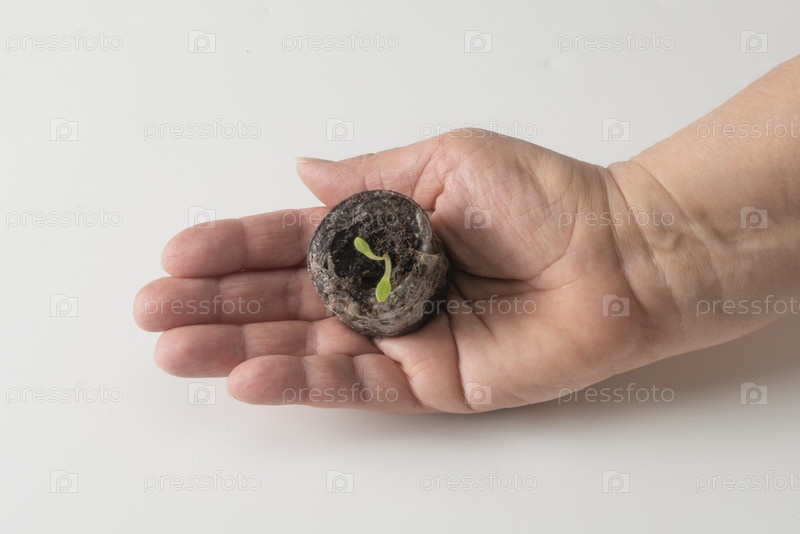 Женщина держит в руке один увлажненный торфяник, из которого выросло цветочное стволо.Изолировано.Вид сверху