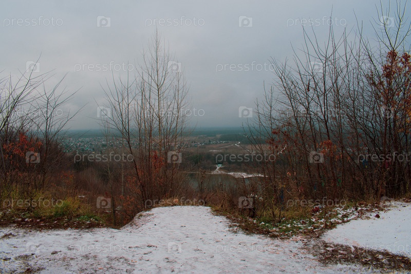 Вид на реку и деревню с высокого берега в осенне-зимний период