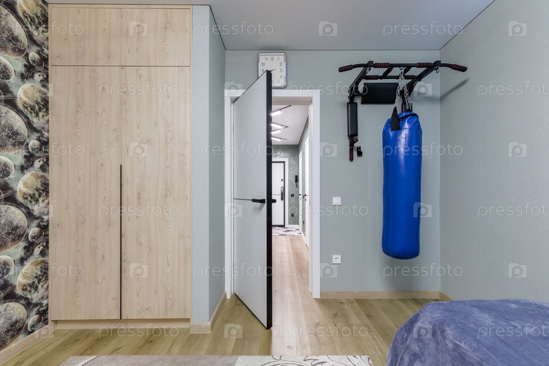Современная комната с голубым ножевым мешком и подтягивающейся стойкой, установленной на серой стене. включает большой легкий деревянный встроенный гардероб, обои космической тематики и вид на ярко освещенный коридор