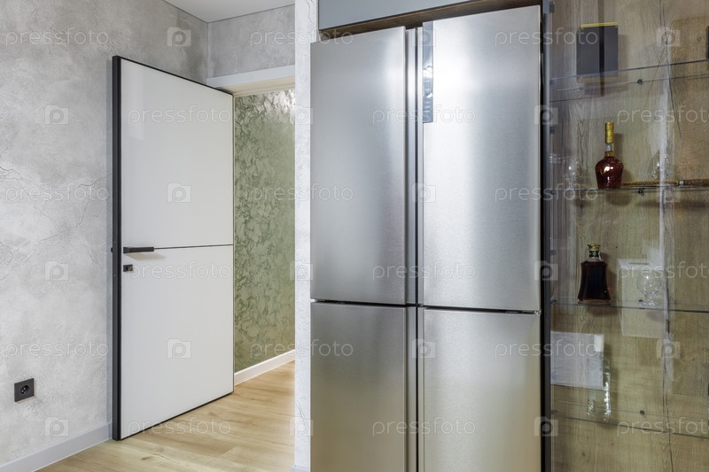 Внутренний вид современной кухни. Она имеет большой четырехдверный холодильник из нержавеющей стали рядом со встроенным стеклянным дисплеем с деревянными полками и бутылками. Белая минималистическая дверь видна на заднем плане