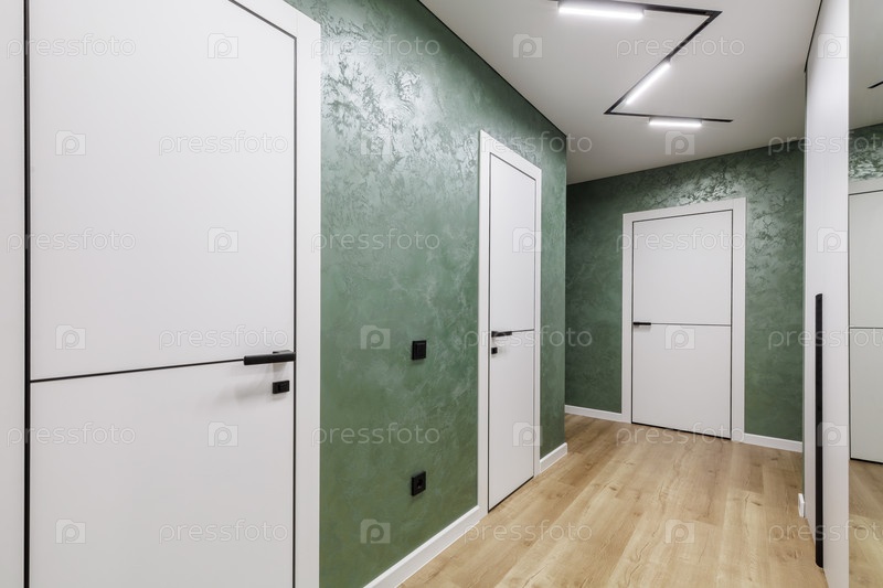 Современный коридор с зелеными текстурированными стенами и видом на туалет
