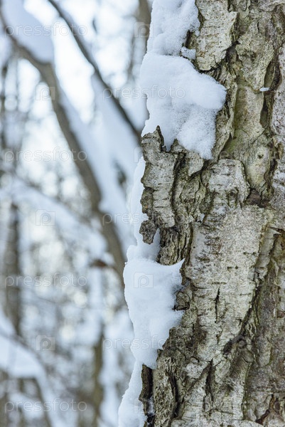 Текстурированная березовая кора дерева, покрытого мягкими снежинками в зимнем лесу
