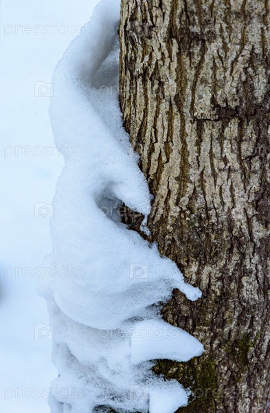 Текстурированная кора деревьев, покрытая мягкими снежинками в зимнем лесу