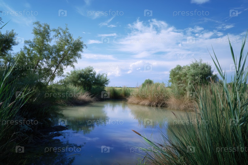 Речной пейзаж с тростником, голубым небом и белыми облаками летом