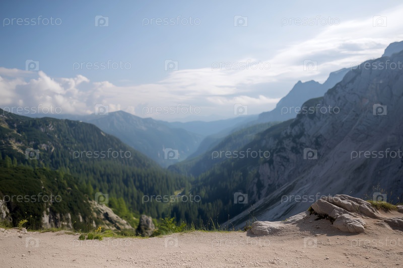 Фон, горный пейзаж с каменной подиумом на переднем плане