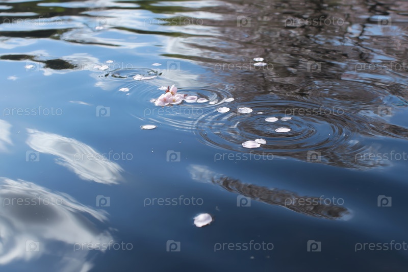 Лепестки вишневых цветов падают в воду с волнами
