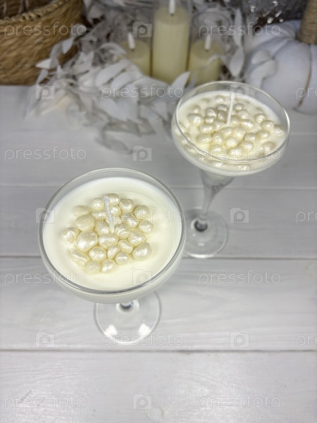 Белые свечи в стеклянной подставке для свечей. Восковые жемчужины у фитила. Свечи на белых досках. Угол наклона