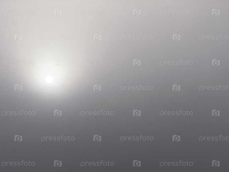 Зимнее серое небо покрыто туманом, сквозь него виден солнечный диск.Зимний пейзаж