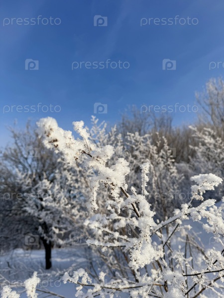 Леса и растения в снегу. В голубом небе. Зимний пейзаж