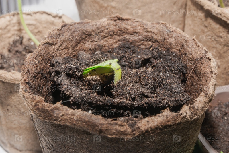 Росток тыквенных семян выходит из почвы в биоразлагаемом торфяном горшке. Макро. Подготовка саженцев для весенней посадки овощей