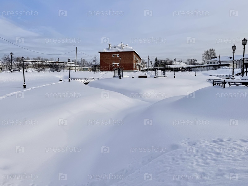 Зимний пейзаж деревни, зимние солнечные дни, никто на улице