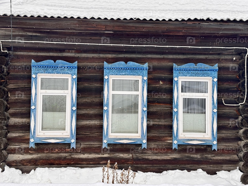 Традиционный русский бревенчатый домик с резными архитравами зимой в деревне