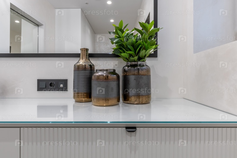 Современные детали интерьера с декоративными керамическими вазами и зеленым растением