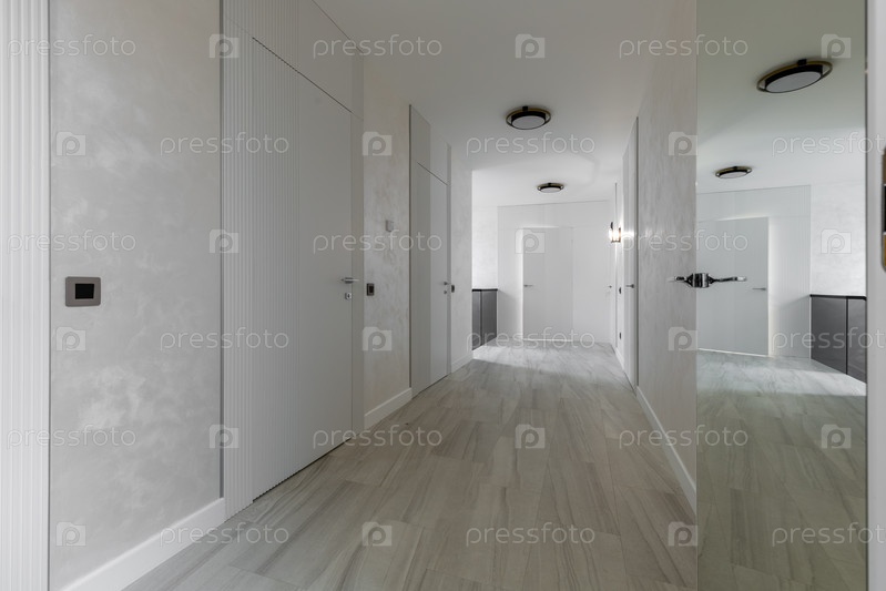 Гладкий современный коридор с белыми стеновыми дверями с вертикальными текстурированными панелями.Минималистское пространство улучшается большой зеркальной поверхностью, стильными круглыми потолками и легкими деревянными напольными плитками