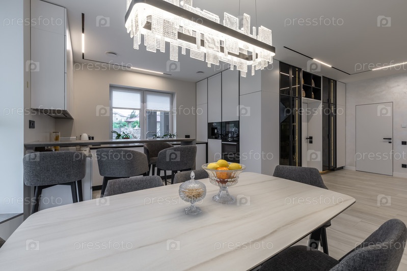 Просторный современный интерьер с мраморным обеденным столом, серыми стульями и изящной кухней с завтраковым баром.В комнате акцентируется потрясающая кристаллическая люстра, линейные потолочные огни и элегантные дисплеи из темного стекла