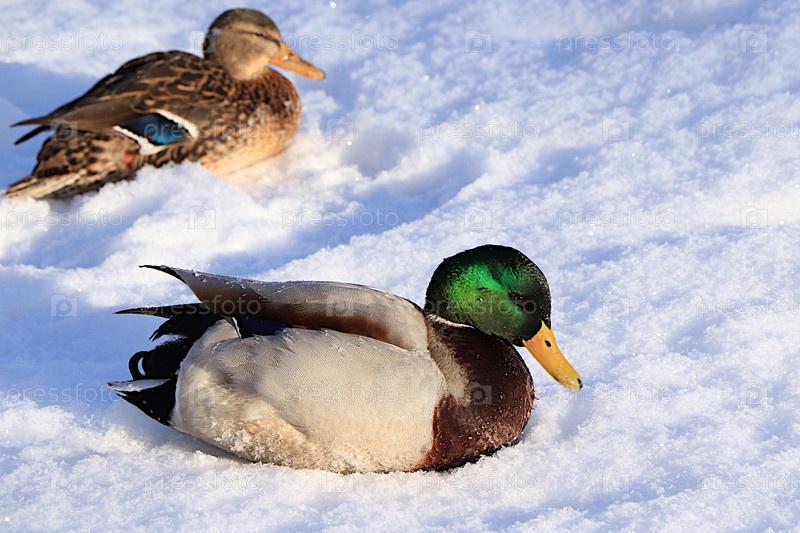 Мальярды и борцы на замороженном озере копаются в снегу, чтобы согреться и спать в снегопаде.Дикие птицы испытывают сильный холод в России.Концепция сострадания и спасения животных