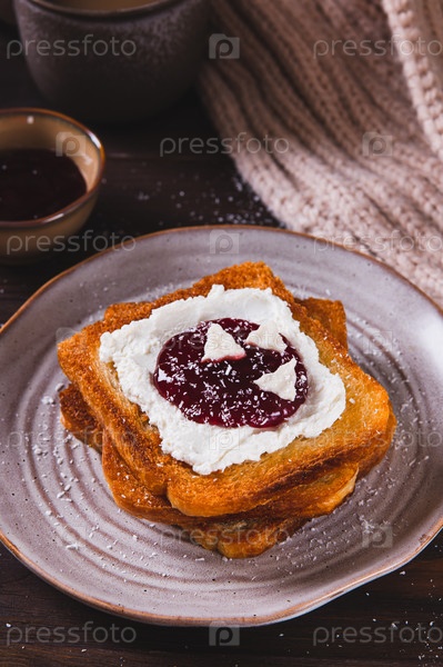 Вкусный тост со сливочным сыром, варенем, пастилем и кокосовыми хлопьями на тарелке с вертикальным видом