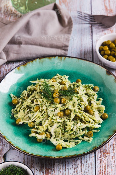 Вегетарианский салат с капустой, зеленым горохом и травами на тарелке на столе вертикальный вид