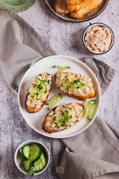 Торсовая печень, яйцо, огурчий салат на тосте на столовой тарелке и вертикальный вид